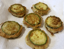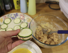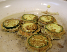 Now take your courgette sandwiches and dip them in the egg before placing them in the frying pan to cook. Ideally you want to aim to fry them on each side for about 2 minutes, so it cooks nicely. After 2 minutes turn them over.
