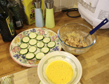 Once you have made that and the courgettes have dried out a bit you are ready to make your sandwiches/pancakes. Take a slice of courgette and place 1 tablespoon of your stuffing on to it. Take another slice of courgette and press this firmly on the other side to sandwich the tuna batter. Do this with all your slices of courgette until you have a plate of sandwiches.